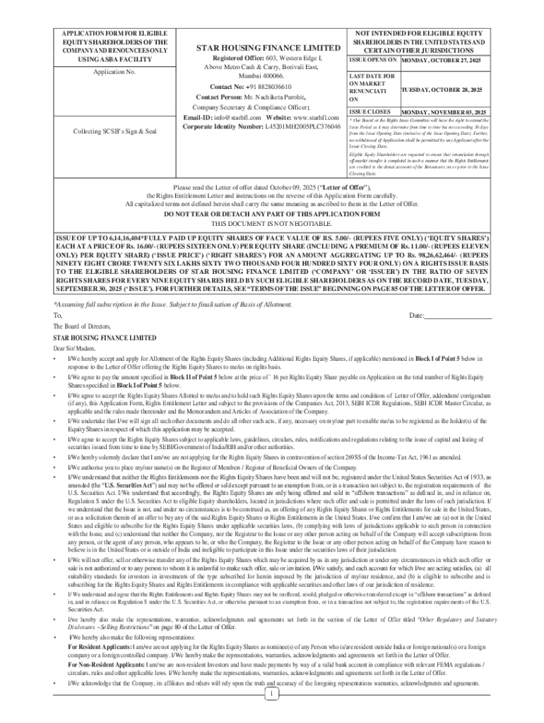Eligible applicants include equity shareholders of Star Housing Finance Limited who are looking to participate in the rights issue.