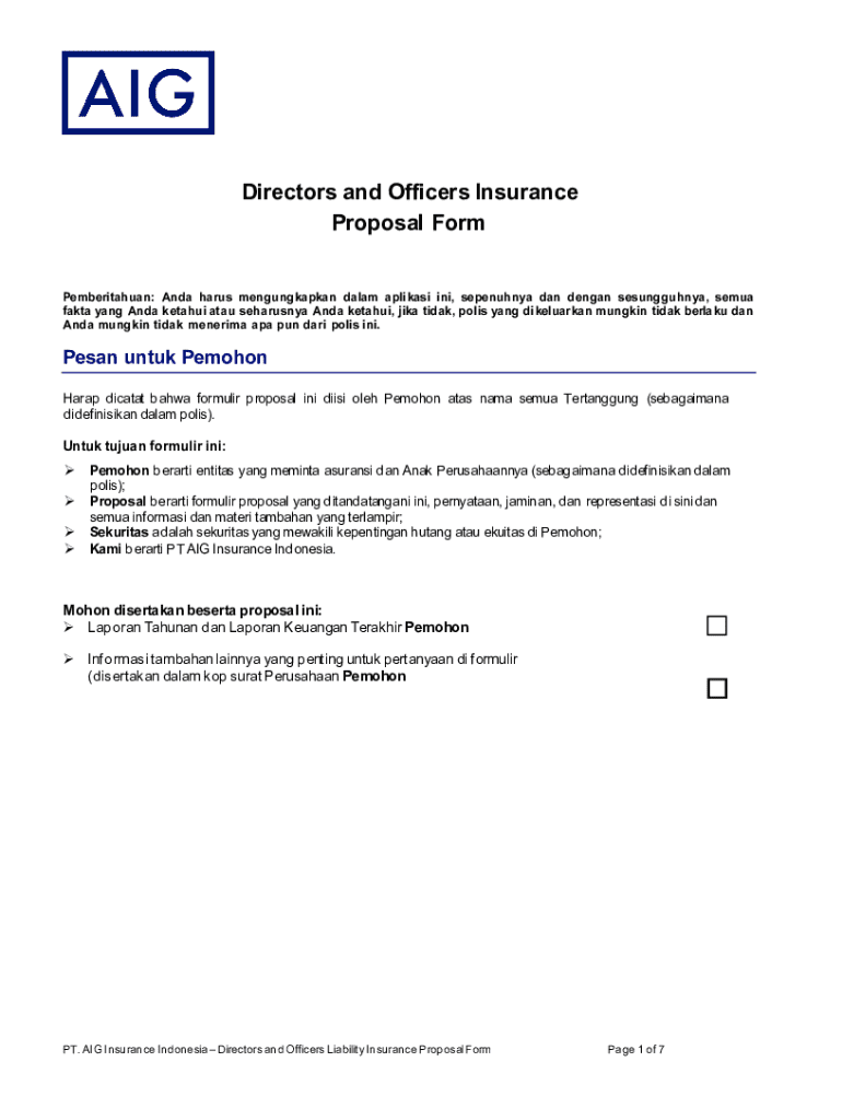 The Directors and Officers (D&O) Insurance Proposal Form is a crucial document used by entities in Indonesia seeking D&O liability insurance. This form serves to provide insurers with comprehensive details about the company and its leadership, ultimately facilitating the acquisition of necessary coverage.