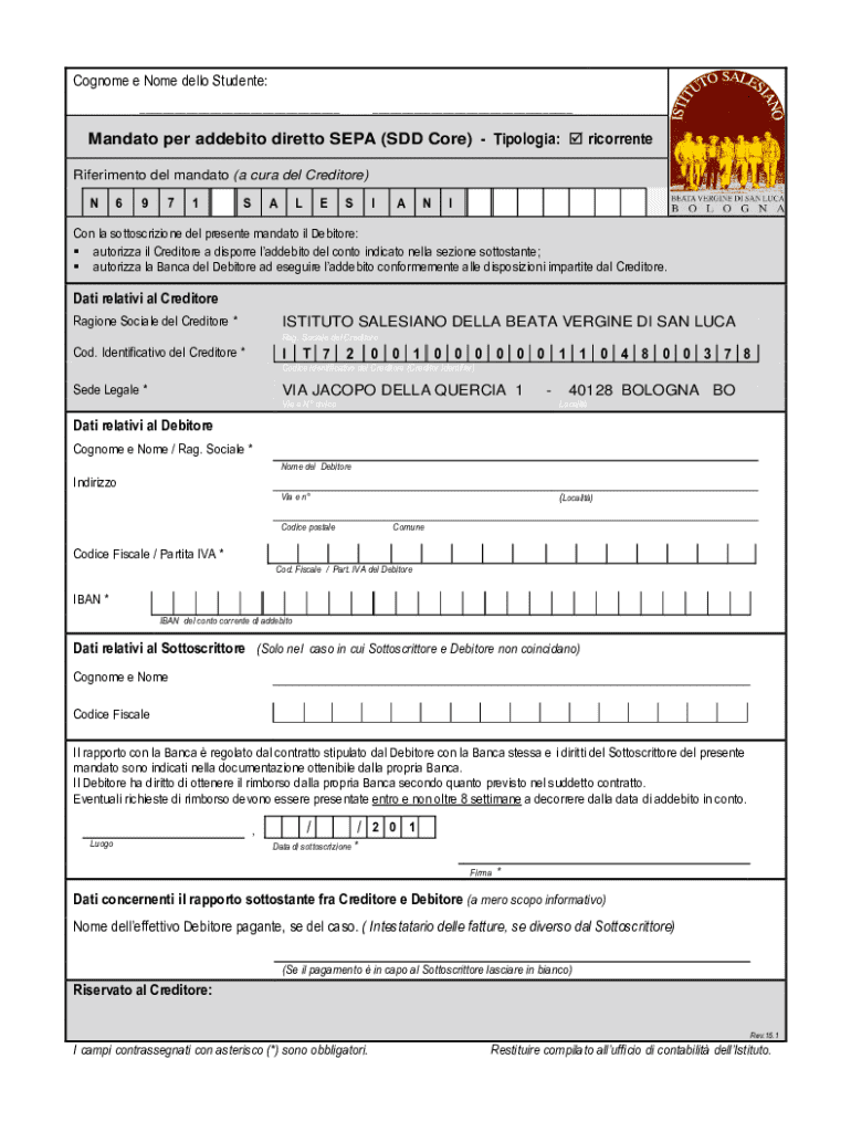 Il mandato per addebito diretto SEPA è un modulo fondamentale in Italia, utilizzato per autorizzare un creditore a prelevare pagamenti ricorrenti dal conto bancario di un debitore. Questo documento è essenziale per gestire i pagamenti continuativi con estrema semplificazione, come nel caso dei servizi periodici offerti da diverse istituzioni, tra cui l'Istituto Salesiano. Il mandato SEPA italiano garantisce la sicurezza e l'affidabilità nella gestione delle transazioni monetarie tra le parti coinvolte.