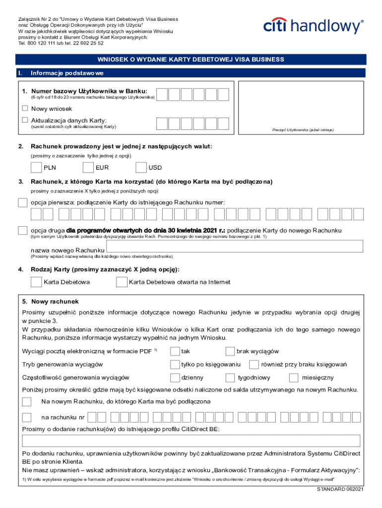 The Visa Business Debit Card Application is a crucial form utilized in Poland for requesting the issuance of a Visa Business Debit Card. This application is essential for businesses seeking an efficient method to manage their expenses and transactions. To successfully complete the application, users must provide specific information, including personal details and account information.