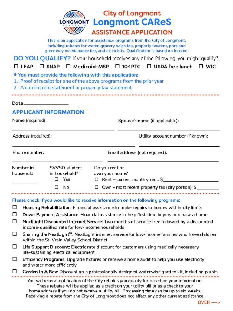 Eligibility is generally limited to income-qualified residents of Longmont, Colorado, who can provide proof of participation in specific assistance programs.
