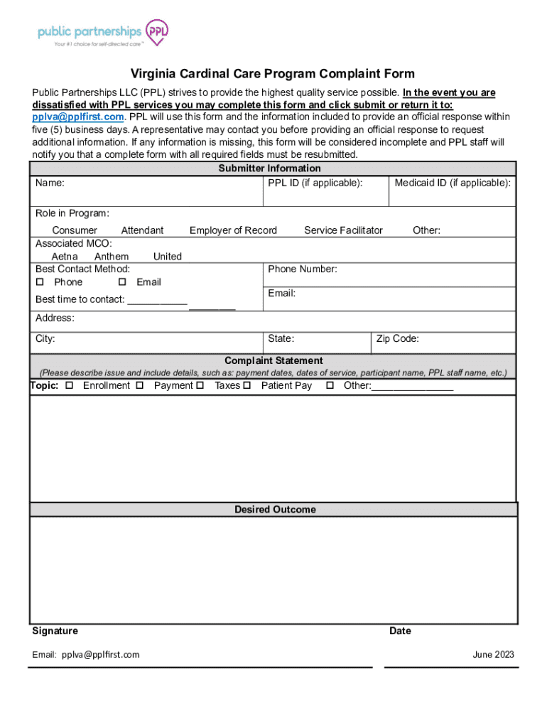 The Virginia Cardinal Care Program Complaint Form is a healthcare document used by individuals to report dissatisfaction with services provided by Public Partnerships LLC (PPL).