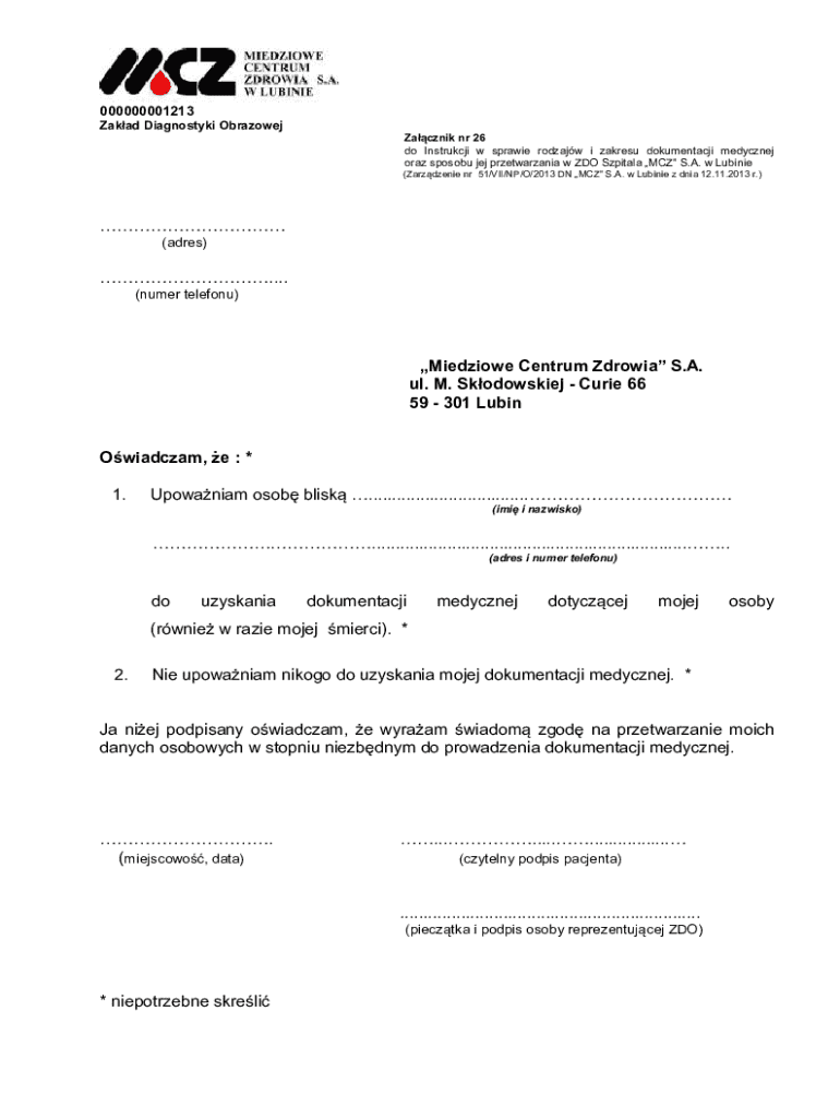 The Medical Documentation Authorization Form is a legal document used by patients in Poland to authorize access to their medical records by designated individuals, including representatives.