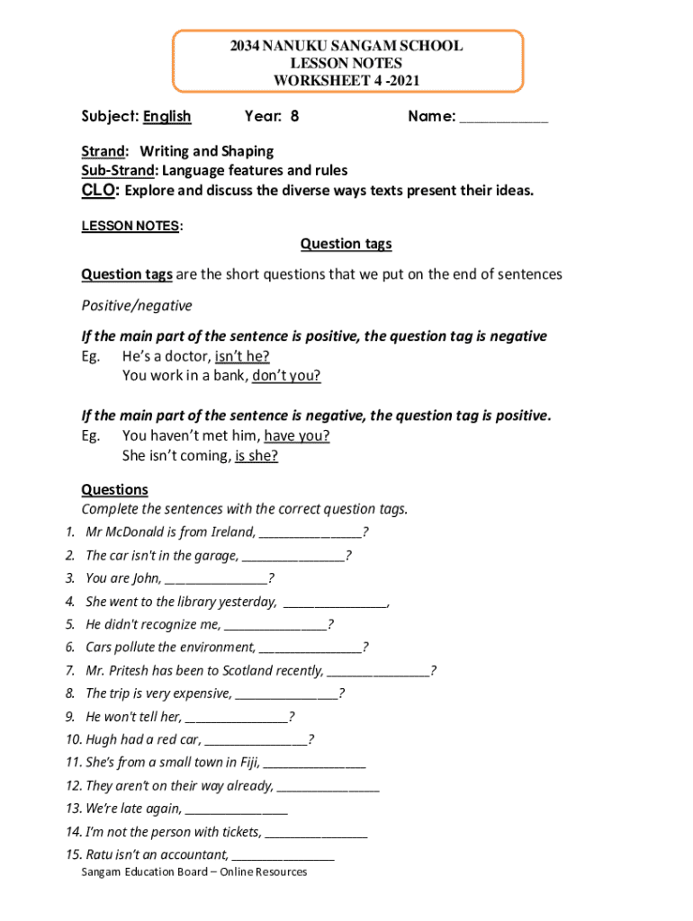 This worksheet is beneficial as it enhances students’ grasp of question tags by providing focused, structured exercises. It can empower educators by offering lesson notes and practical exercises that promote active learning.