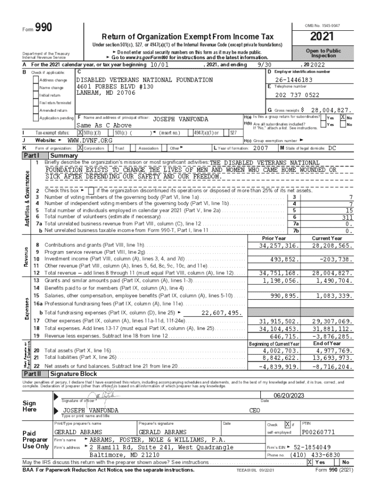 Form 990 serves as a crucial reporting document for tax-exempt organizations across the United States. Specifically, the 2021 version is significant for entities like the Disabled Veterans National Foundation, as it details their financial activities and overall mission. This IRS Form 990 enables organizations to maintain transparency and provide critical data to stakeholders.