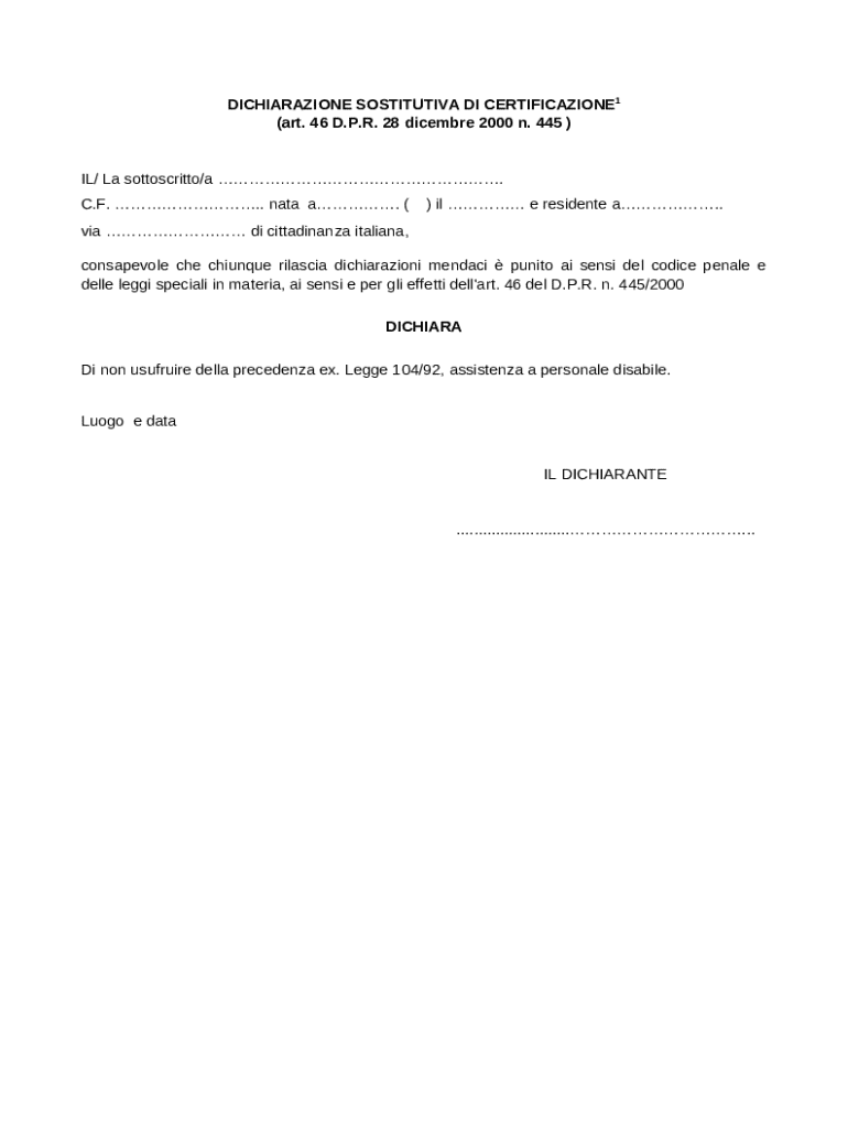 Ottieni il gratuito Dichiarazione Sostitutiva di Certificazione