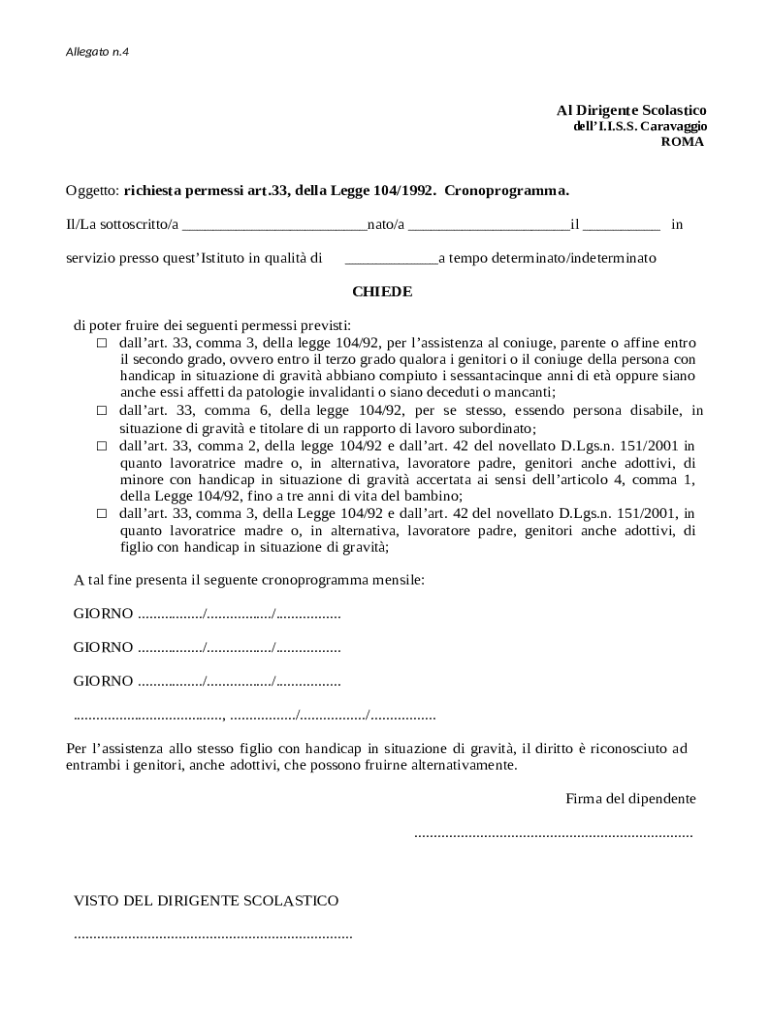 Il Modulo di Richiesta di Congedo per Dipendenti in Italia è un documento utilizzato dai dipendenti per richiedere congedo secondo l'Articolo 33 della Legge 104/1992 per assistere un familiare disabile o per la propria disabilità.