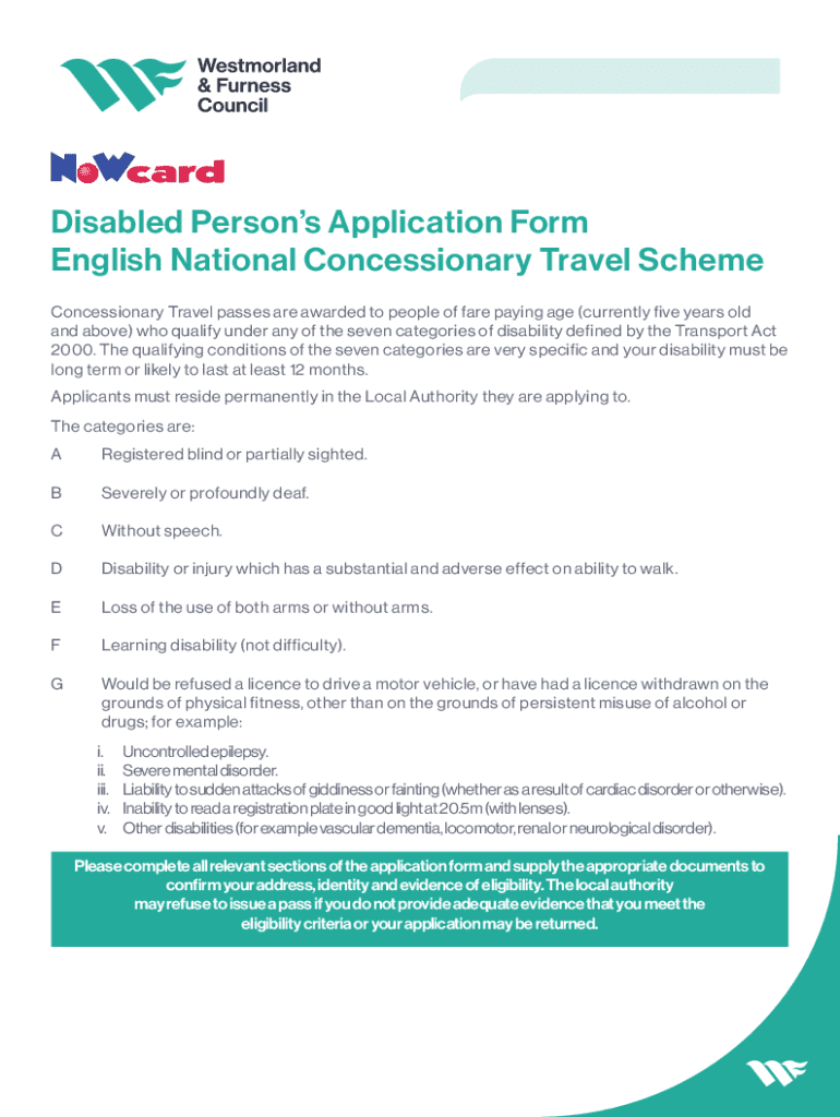 The Disabled Person’s Application Form serves a crucial role in applying for a bus pass through the English National Concessionary Travel Scheme. This form ensures that eligible individuals can access essential travel benefits, defined by the Transport Act 2000. Completing the Disabled Person’s Application Form is essential for those who qualify, as it links them to the necessary resources for mobility and independence.