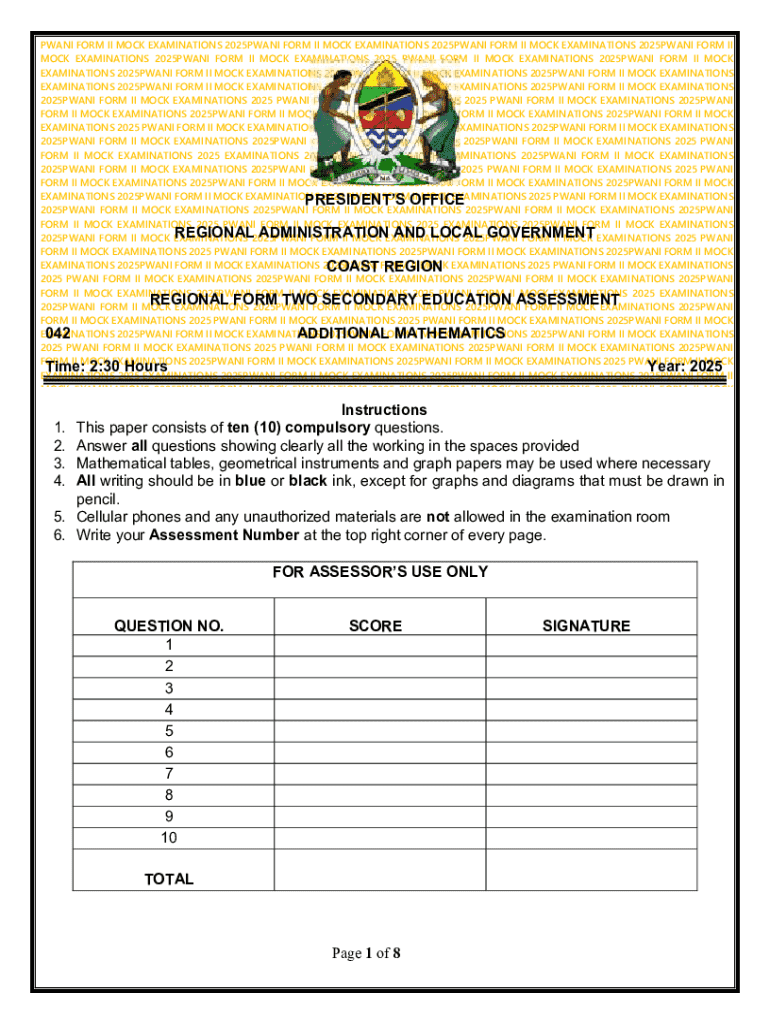 The Pwani Form II Mock Examinations 2025 is a comprehensive template designed for conducting mock exams among Form II students in the Pwani region. This form serves as a critical instrument in preparing students for their secondary education assessments. By incorporating various sections, such as instructions for candidates, answer spaces, and areas designated for assessors, it ensures a structured approach to mock examinations. Utilizing mock exam papers, such as this one, significantly enhances student readiness for future evaluations, emphasizing the vital role these assessments play in the educational landscape.