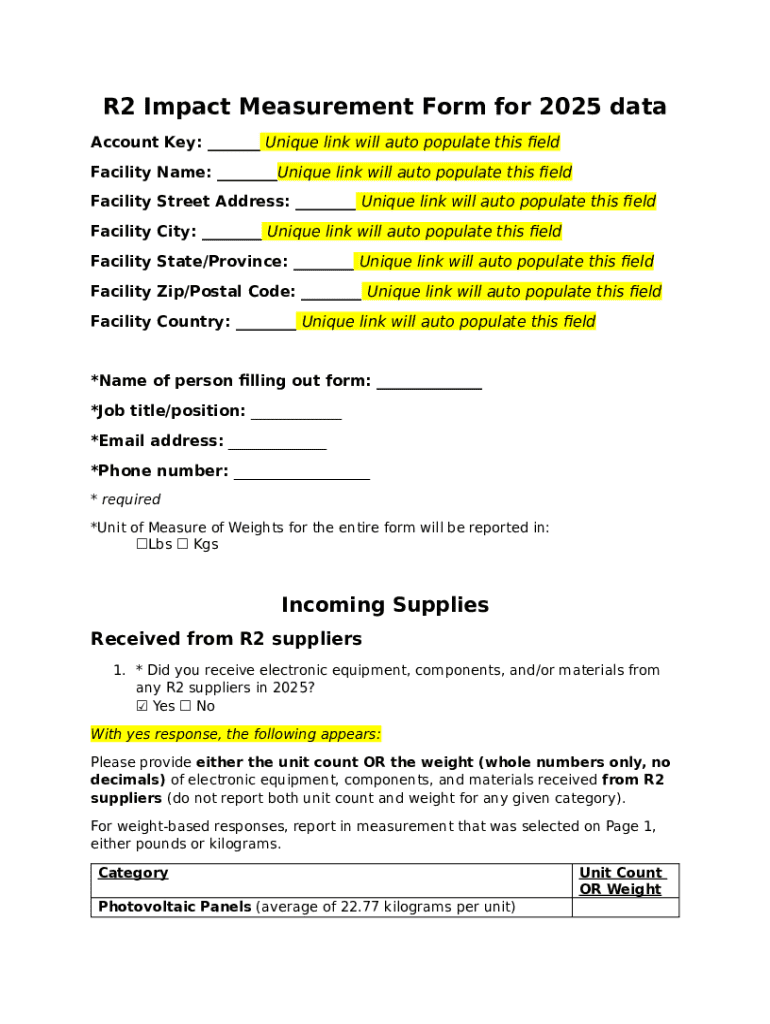 The R2 Impact Measurement Form is a crucial tool designed for assessing the impact of electronic equipment received from both R2 and non-R2 suppliers. This form allows businesses to collect essential data regarding facility information and equipment specifications. Understanding the distinction between R2-certified suppliers and non-R2 suppliers is vital for accurate reporting and compliance.