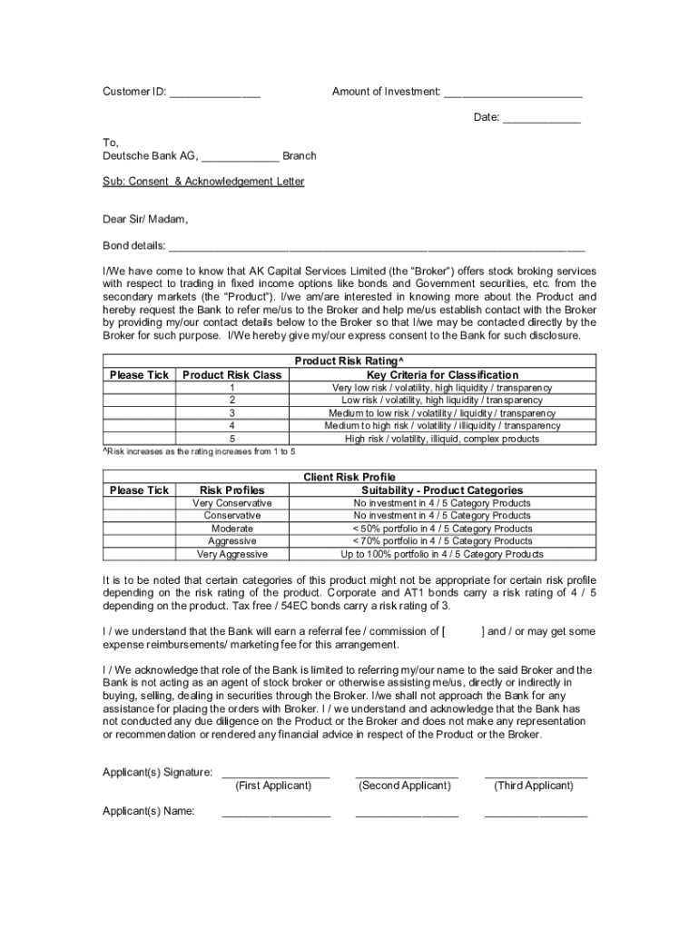 By completing this investment consent form, customers ensure that they understand the risks involved in the investment process. It effectively facilitates the disclosure between Deutsche Bank and its brokers, enhancing the overall investment experience for clients seeking opportunities in bonds and similar products.