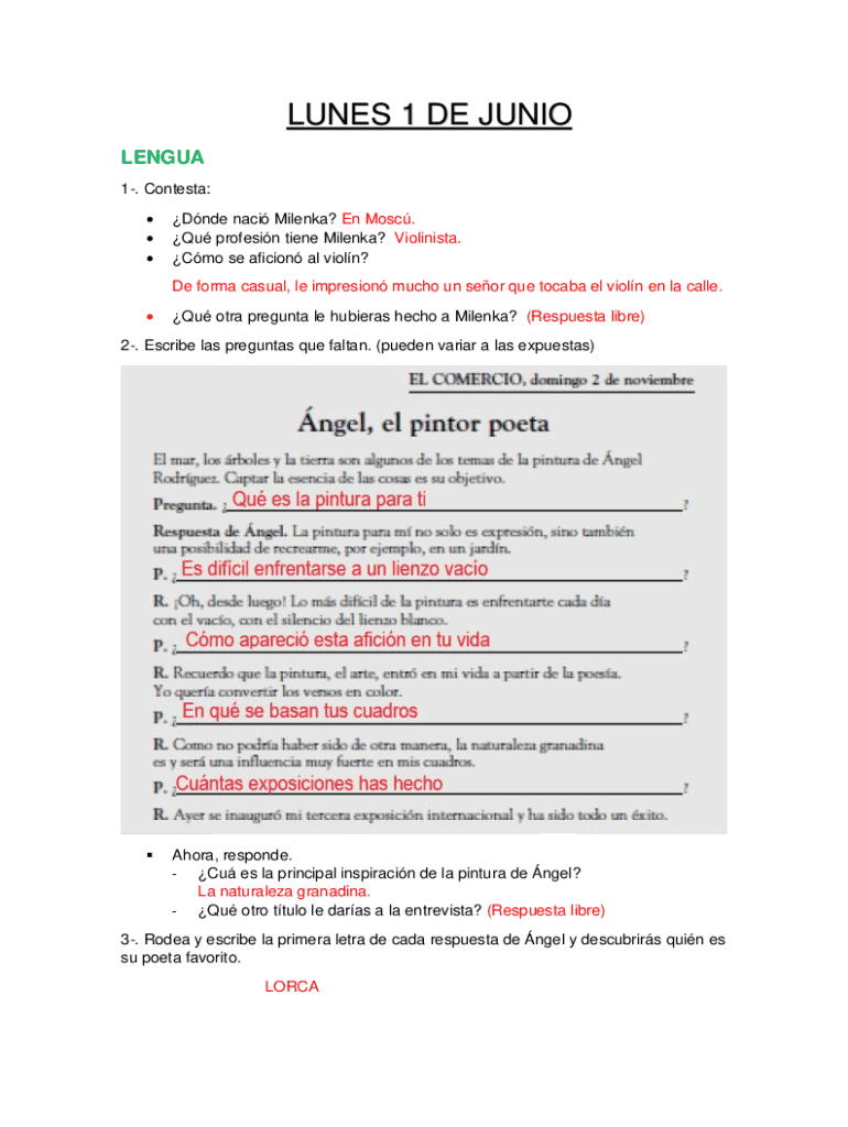 El documento incluye varias secciones: preguntas sobre Milenka, una entrevista con Ángel y problemas de matemáticas.