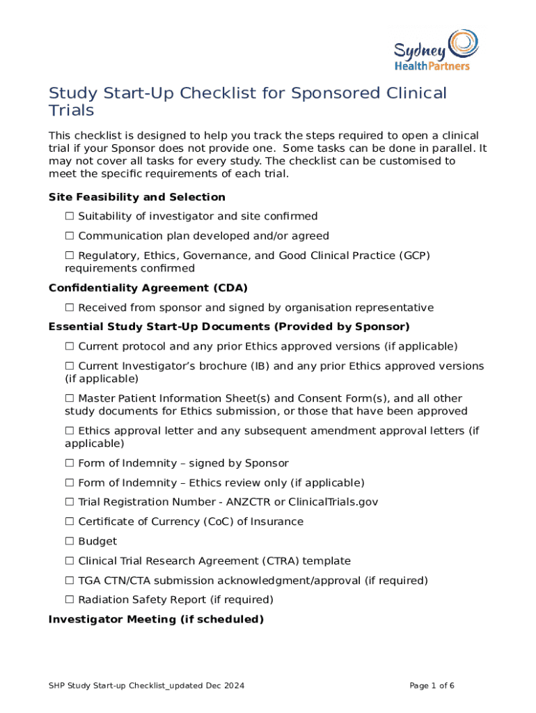 The Clinical Trial Start-Up Checklist is a healthcare form used by sponsors and researchers to ensure all tasks are completed before initiating a clinical trial.