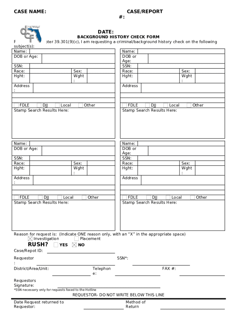 You will need to provide detailed personal information including the subject's name, date of birth, Social Security Number, race, sex, height, weight, and address to fill out the Background History Check Form accurately.