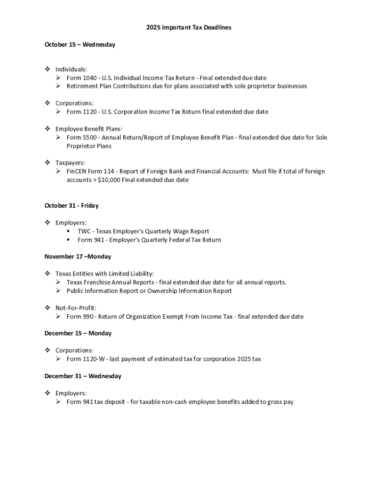 The year 2025 brings several critical tax deadlines that individuals and businesses must adhere to. Key forms such as Form 1040, Form 1120, and Form 941 have specific due dates set by the IRS. For Texas residents, it's essential to note any extensions or state-specific deadlines that may vary from federal requirements.
