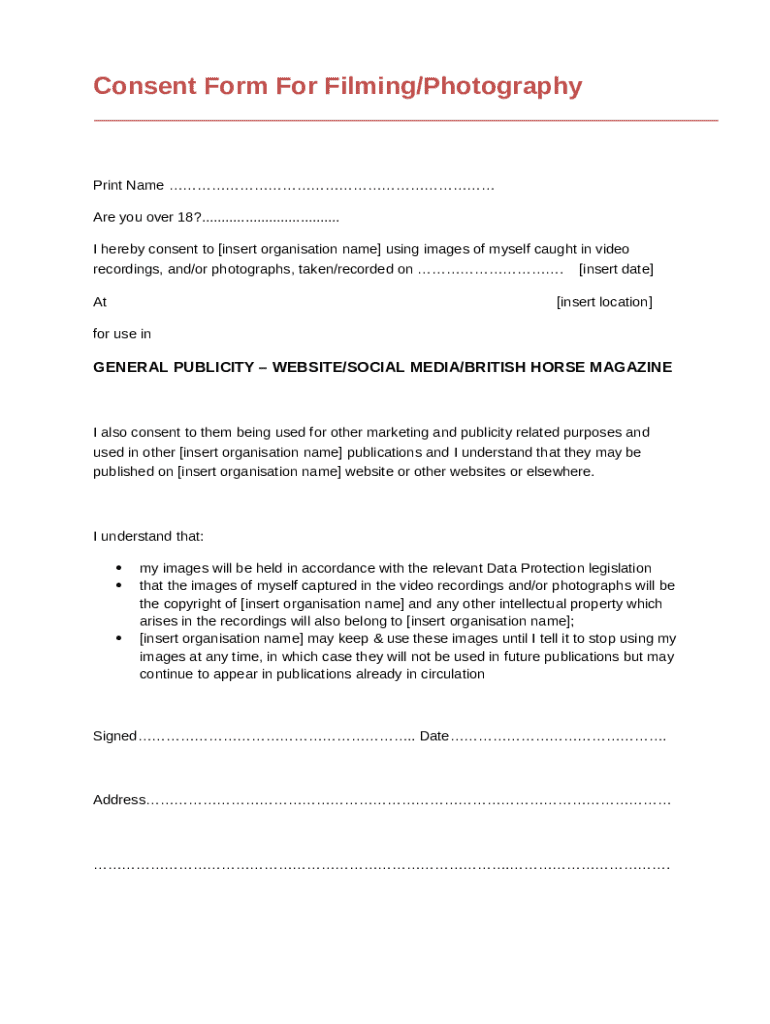 The Consent Form For Filming/Photography is a legal document used by organizations to obtain permission from individuals to use their images for publicity and marketing purposes.