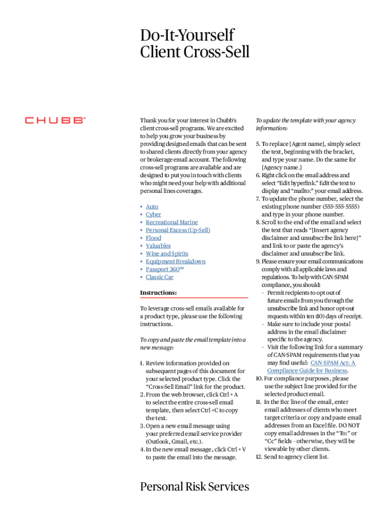 The Chubb Client Cross-Sell Email Templates is a service agreement used by insurance agencies to enhance their client outreach through customizable email templates for various cross-sell programs.