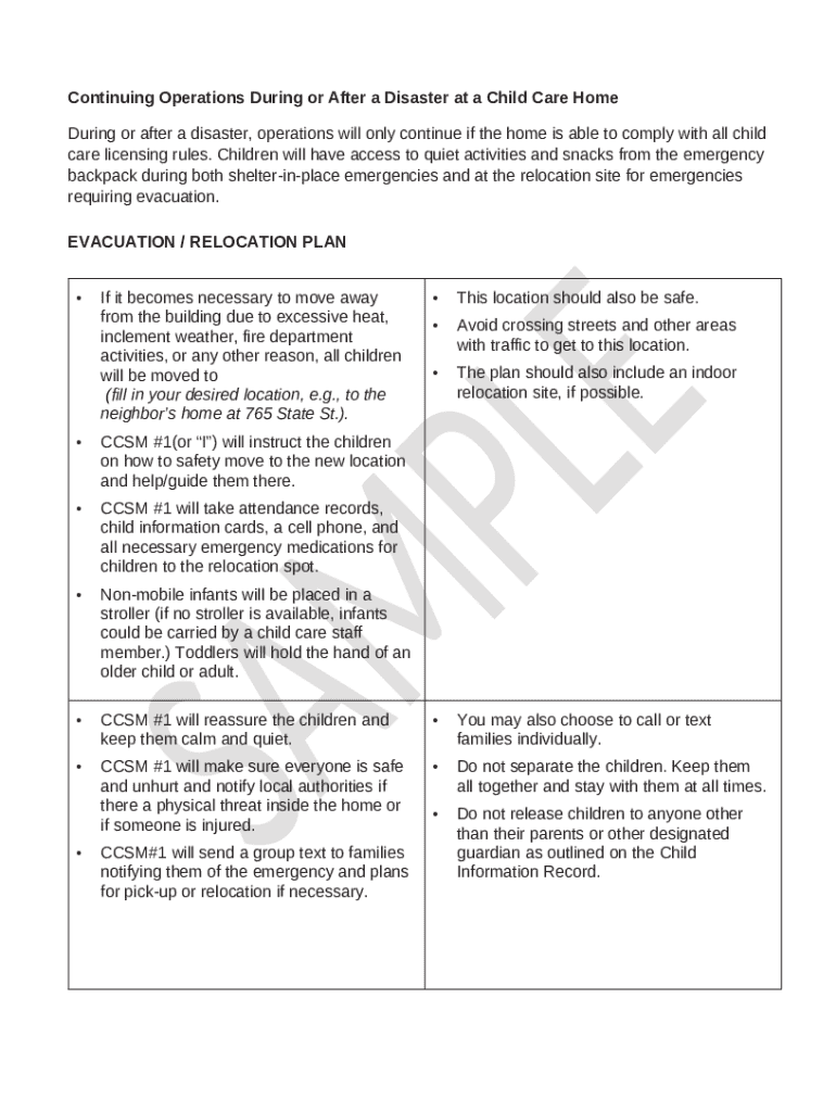 The Child Care Home Disaster Plan is a vital document designed to outline necessary procedures for child care facilities in Michigan during emergencies. This plan ensures preparedness, addressing both evacuation and shelter in place protocols crucial for child safety. By implementing a comprehensive child care disaster plan, facilities can enhance their readiness in unforeseen circumstances.