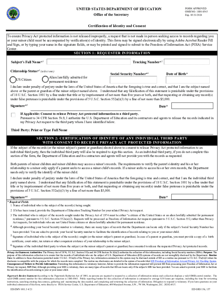 Get the free US Department of Education Certification of Identity and Consent