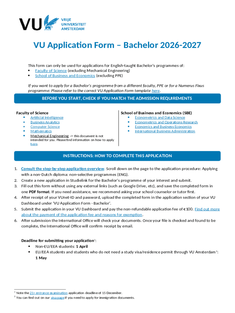 The VU Bachelor Application Form is a college application document used by prospective students to apply for English-taught Bachelor’s programmes at VU Amsterdam for the academic year 2026-2027.