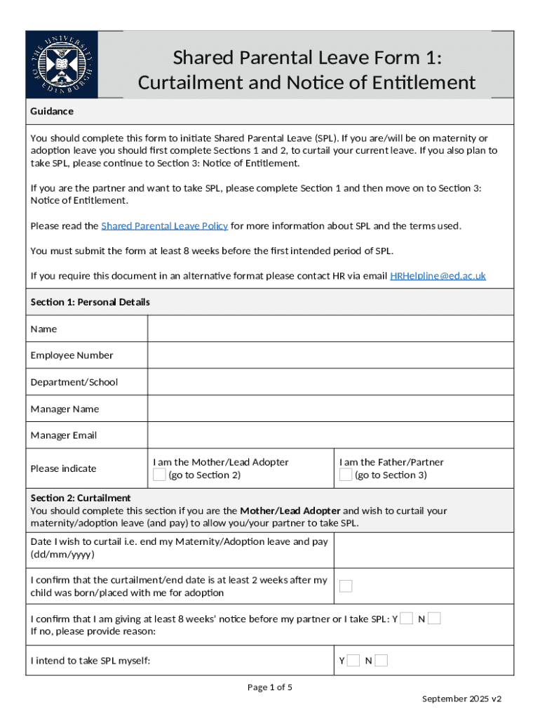 The Shared Parental Leave Form 1 is an employment document used by employees of the University of Edinburgh to initiate Shared Parental Leave (SPL).