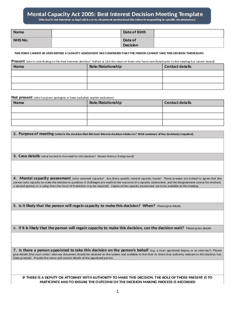 Get the free Mental Capacity Act 2005 Best Interest Decision Meeting Template