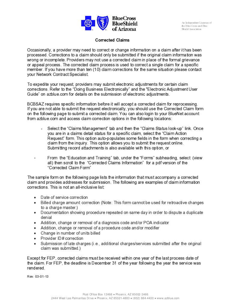 The Corrected Claim Form can be used by any healthcare provider who needs to submit a correction to a previously processed claim with Blue Cross Blue Shield of Arizona.