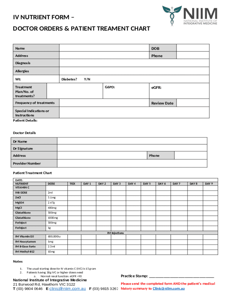 Doctors use the IV Nutrient Form to convey important treatment details, including patient information, diagnosis, and specific nutrient doses. In Victoria, Australia, this form is integrated with the National Institute of Integrative Medicine, enhancing its credibility and application in integrative healthcare practices.