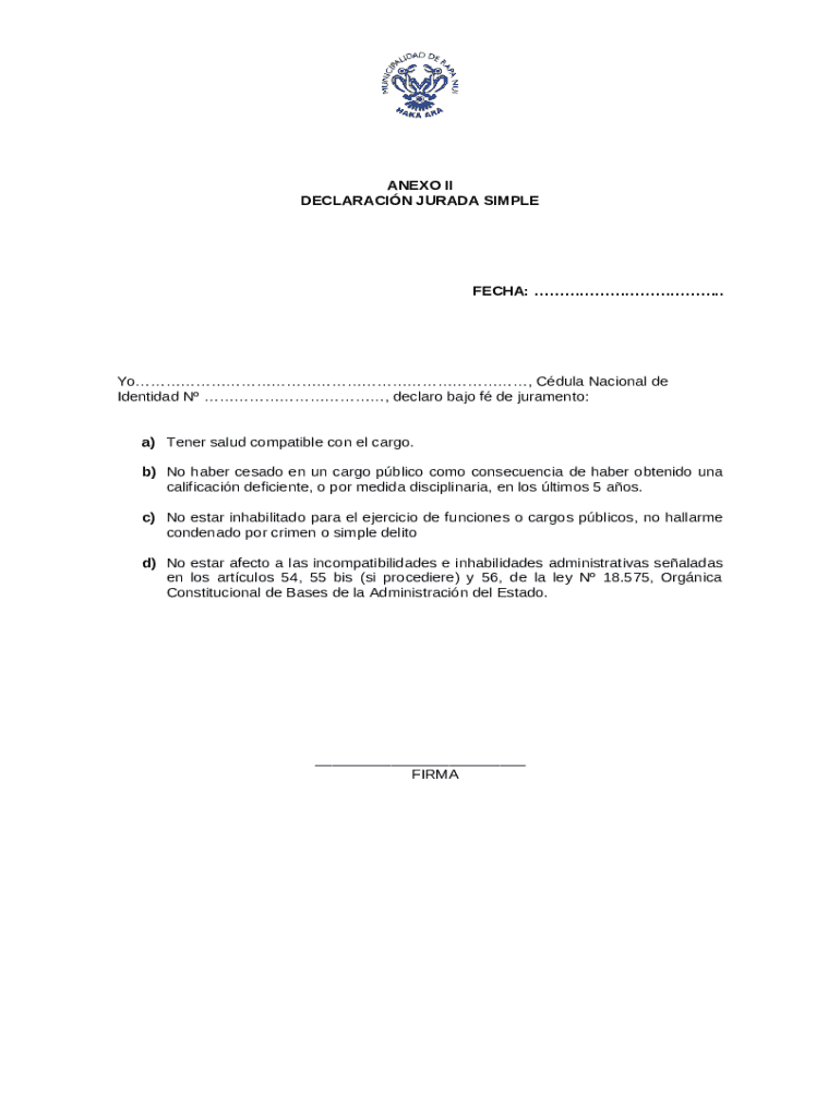 Grupos específicos deben presentar el affidavit, tales como funcionarios gubernamentales, postulantes a cargos municipales y civiles. Ejemplos de posiciones públicas que requieren este documento incluyen alcaldes, concejales y directores de entidades públicas. Comprender los eligibility criteria for the Chile Simple Affidavit es fundamental para evitar inconvenientes en el proceso de selección.