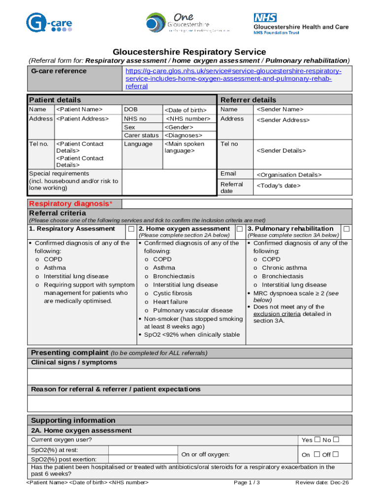 The Gloucestershire Respiratory Service Referral Form is a crucial document used in healthcare to facilitate patient referrals for respiratory assessment and rehabilitation services. This patient referral form plays a significant role in ensuring individuals in need of respiratory care receive timely evaluations and treatment. Understanding its relevance is essential for both healthcare providers and patients requiring specialized respiratory services.