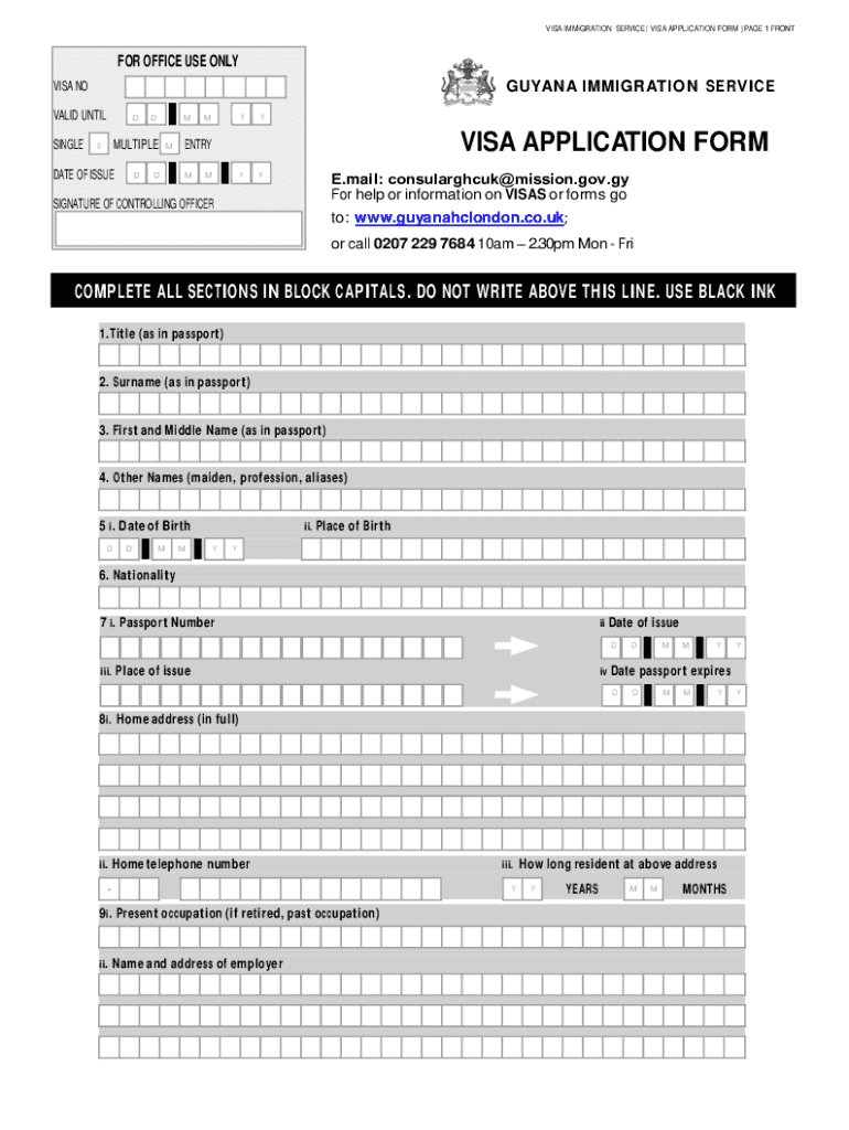 The Guyana Visa Application Form is an official document required for individuals seeking to obtain a visa to enter Guyana. Issued by the Guyana Immigration Service, this form plays a crucial role in the visa application process, ensuring that travelers provide all necessary personal and travel information. It's essential to complete the form accurately, as any errors can lead to delays or rejections. The form remains valid for a specified period, emphasizing the importance of timeliness in submissions.