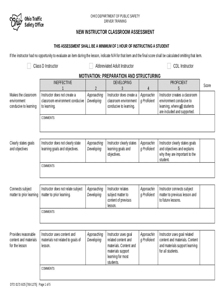 The Ohio Driver Training Classroom Assessment Form is a teacher evaluation form used by training managers and instructors to assess the performance of new driver training instructors in Ohio.