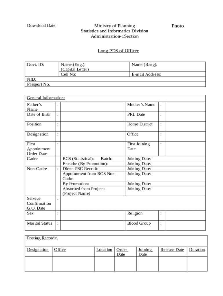 The form is primarily for officers within the Bangladesh Civil Service, particularly those in statistical roles, who need to document their personal and professional information.