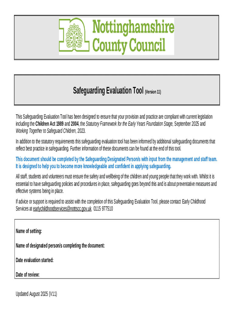 The Safeguarding Evaluation Tool is specifically designed to assist educational settings in Nottinghamshire with compliance to UK safeguarding laws. This tool is pivotal in enhancing child protection and safeguarding policies across various institutions. It undergoes annual updates to align with current legislation, ensuring ongoing relevance in safeguarding practices.
