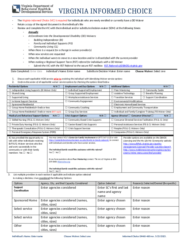 The Virginia Informed Choice Form is designed for individuals who are newly enrolled or currently enrolled in the Developmental Disability Waiver program in Virginia.