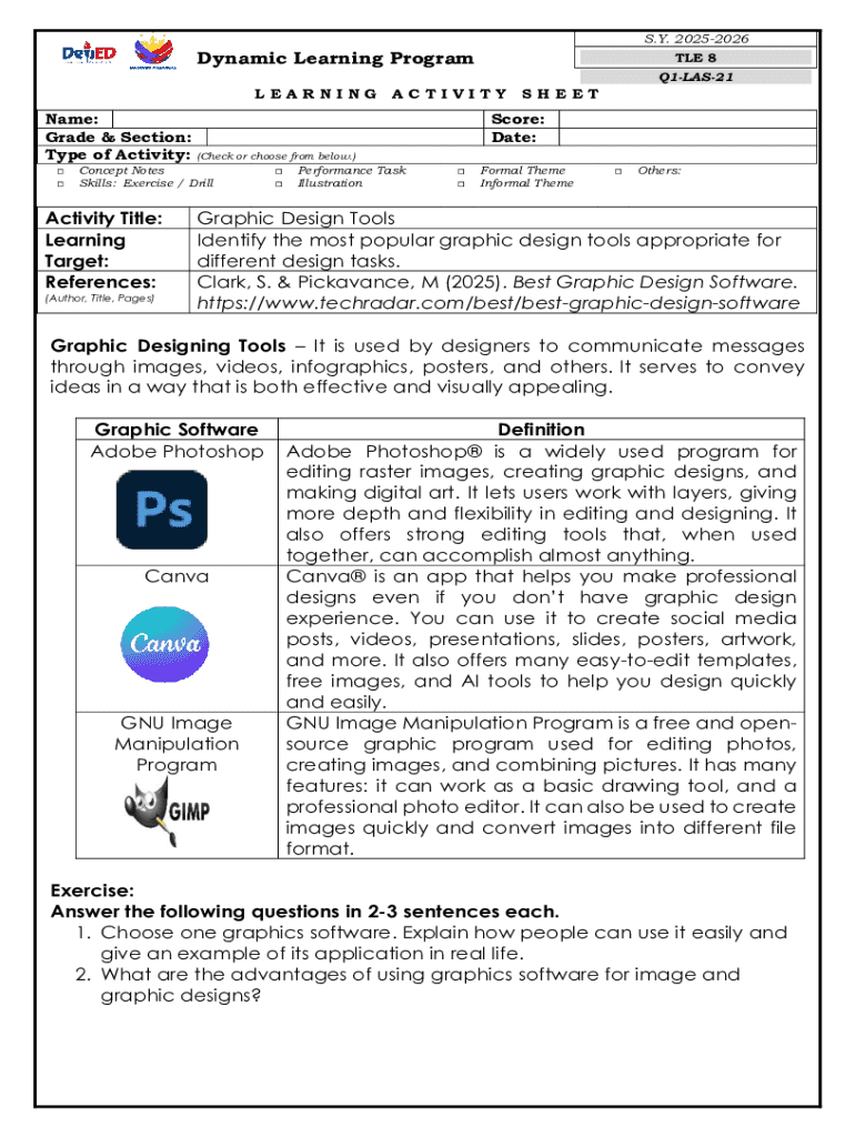 The TLE 8 Learning Activity Sheet is a key component of the Dynamic Learning Program. This educational activity sheet is specifically designed for students in the school year 2, focusing on identifying and using graphic design tools. The form allows students to engage actively in their learning process while tracking their progress effectively.