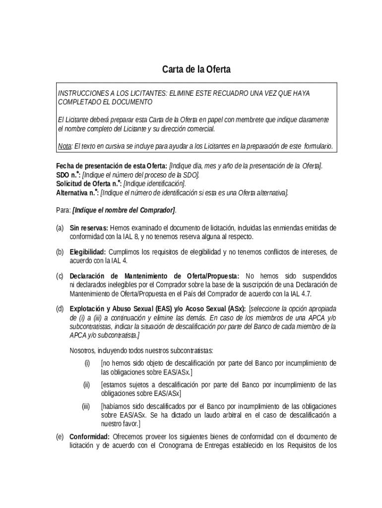 La Carta de la Oferta incluye varias secciones y campos importantes que deben completarse. Algunas de las secciones esenciales incluyen: