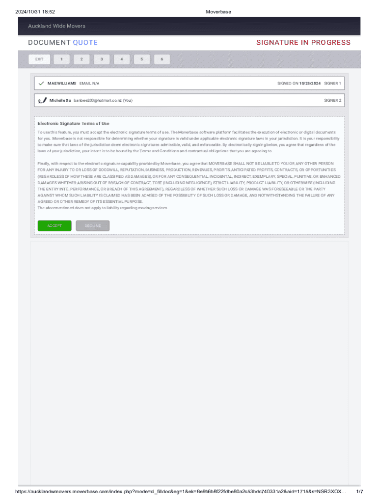 The Moverbase Quote Signature Agreement is a service agreement used by Auckland Wide Movers to facilitate electronic signatures for moving service quotes.
