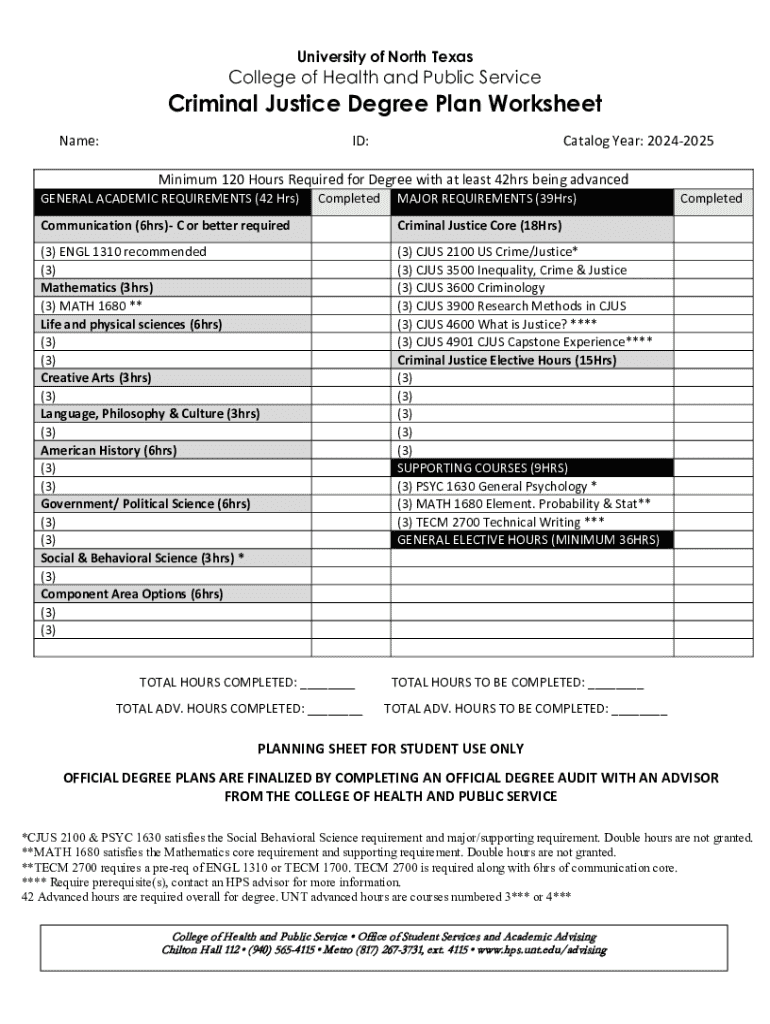 The Criminal Justice Degree Plan Worksheet is an educational document used by students at the University of North Texas to outline and manage their degree requirements for the Criminal Justice program.
