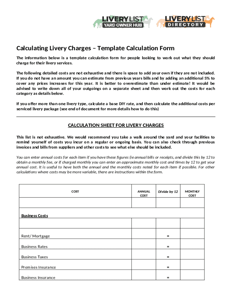 Get the free Livery Charges Calculation Template