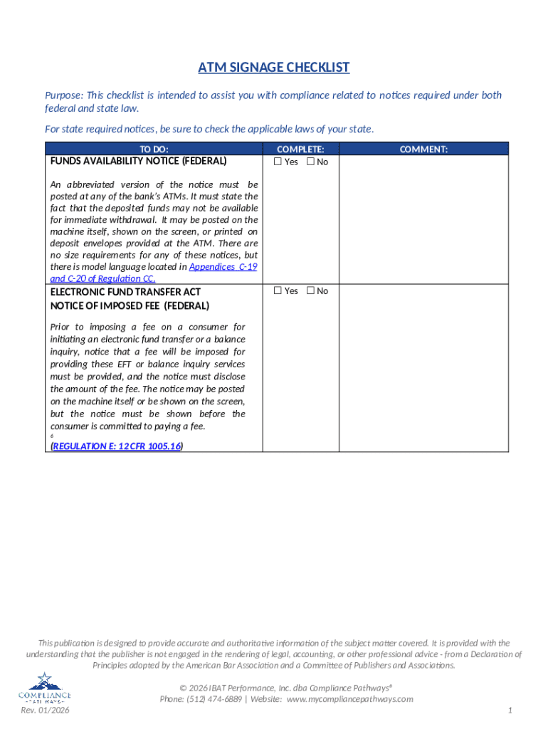 This checklist is primarily designed for compliance officers, bank managers, and auditors within financial institutions to ensure that ATM signage meets legal standards.