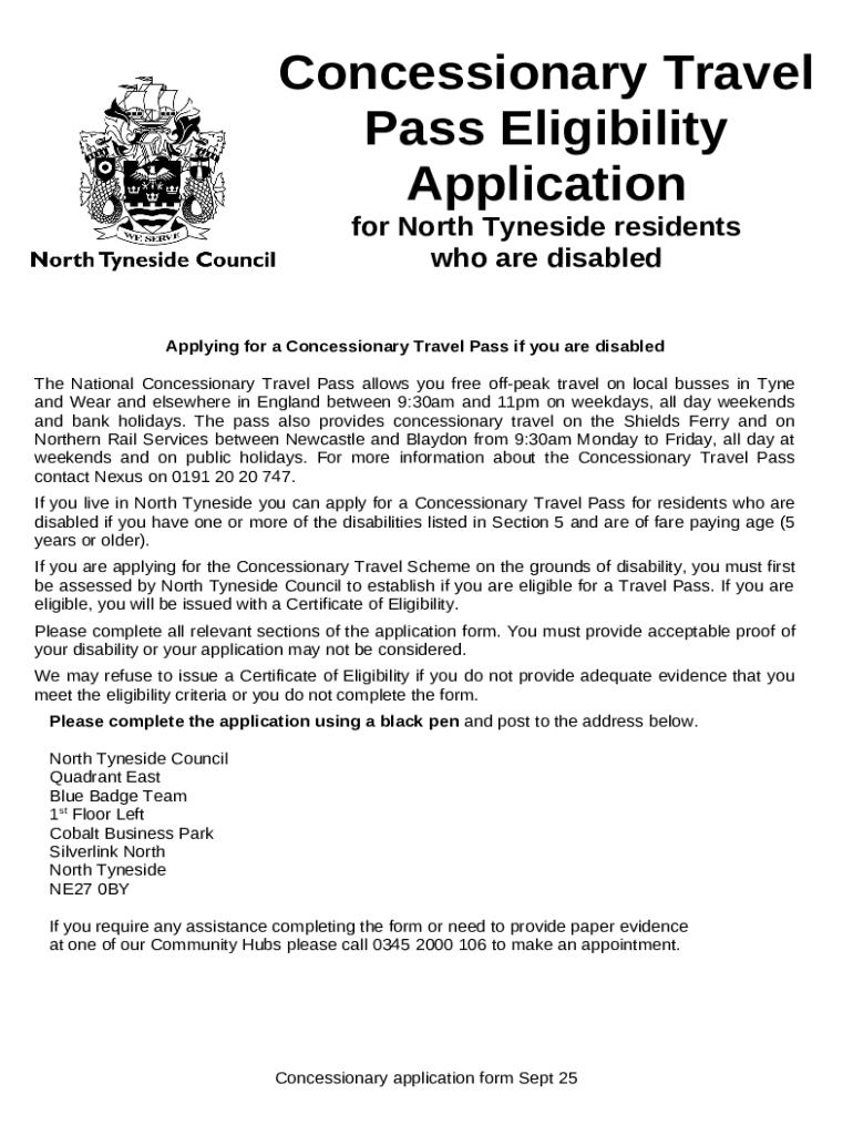 The eligibility to apply for the Concessionary Travel Pass primarily includes disabled individuals who meet specific qualifications set by the North Tyneside Council. Applicants must provide relevant documentation proving their disability status.