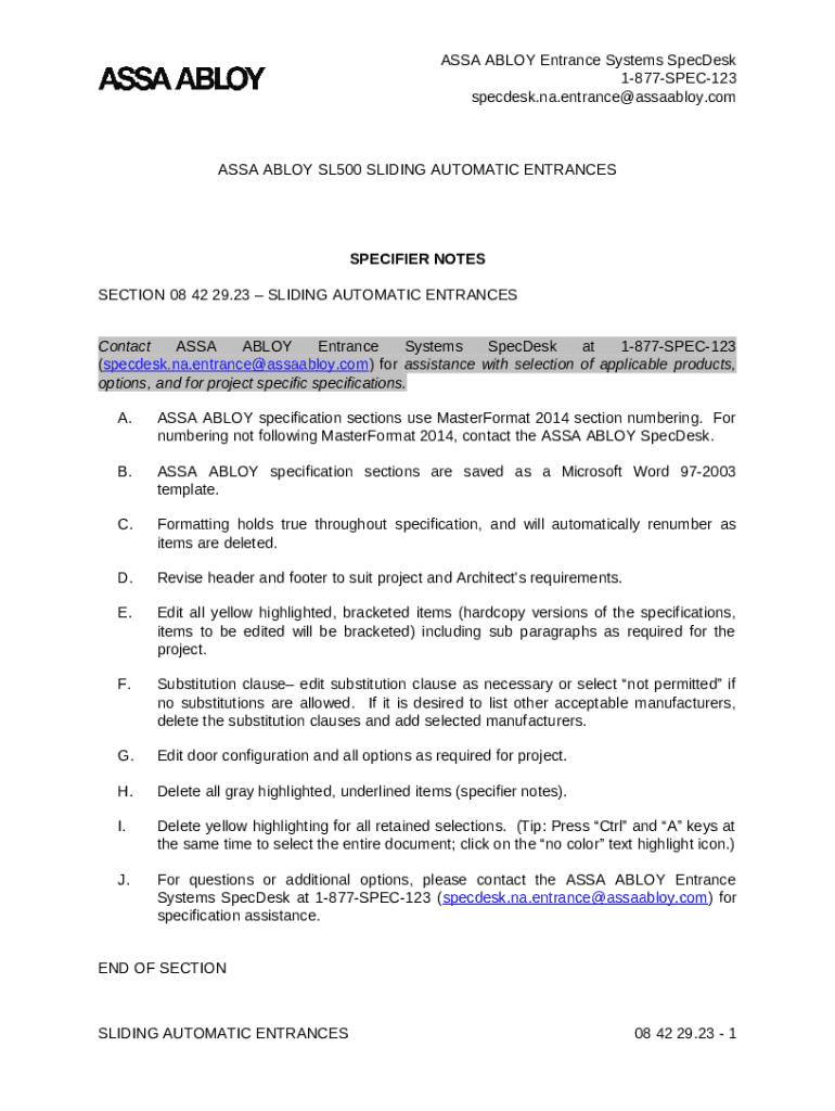 The ASSA ABLOY Sliding Automatic Entrances Specifier Notes is a template used by architects and specifiers to customize project-specific specifications for ASSA ABLOY SL500 Sliding Automatic Entrances.