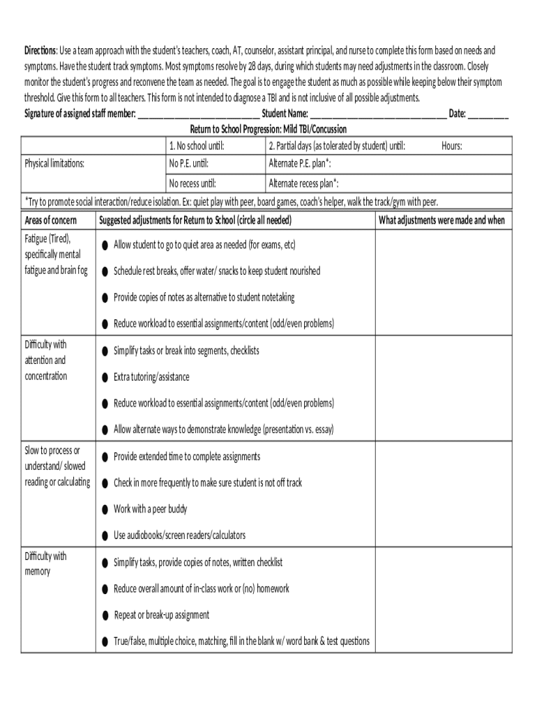 The Return to School Progression Form should be filled out by assigned staff members associated with students experiencing mild TBI or concussion, including teachers, school nurses, and athletic trainers.