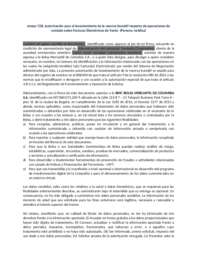 El Anexo 72B Authorization Form es un documento utilizado por representantes legales en Colombia para autorizar el levantamiento de la reserva del mercado de valores en operaciones de ventas electrónicas.