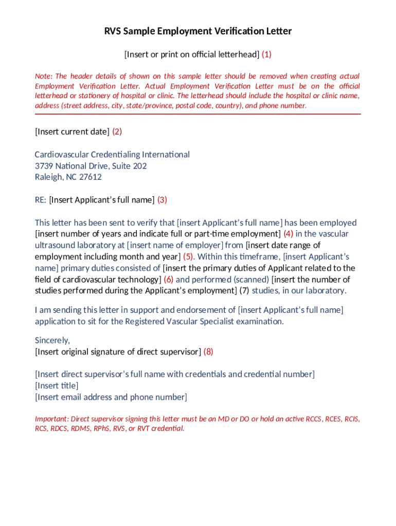 Typically, any applicant applying for the Registered Vascular Specialist examination can request an Employment Verification Letter. The letter must be issued by a direct supervisor who can attest to their employment history.