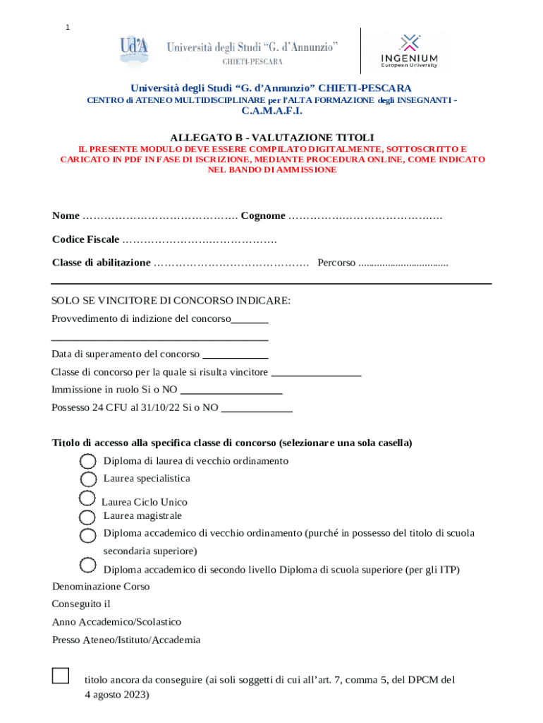 L'Allegato B - Valutazione Titoli è un modulo essenziale utilizzato per l'ammissione a corsi di formazione per insegnanti presso l'Università degli Studi 'G. d'Annunzio' Chieti-Pescara. Questo modulo è fondamentale per la valutazione dei titoli accademici e delle qualifiche del candidato, che devono essere documentati con dettagli riguardanti il percorso educativo, comprese lauree e altri traguardi accademici significativi.