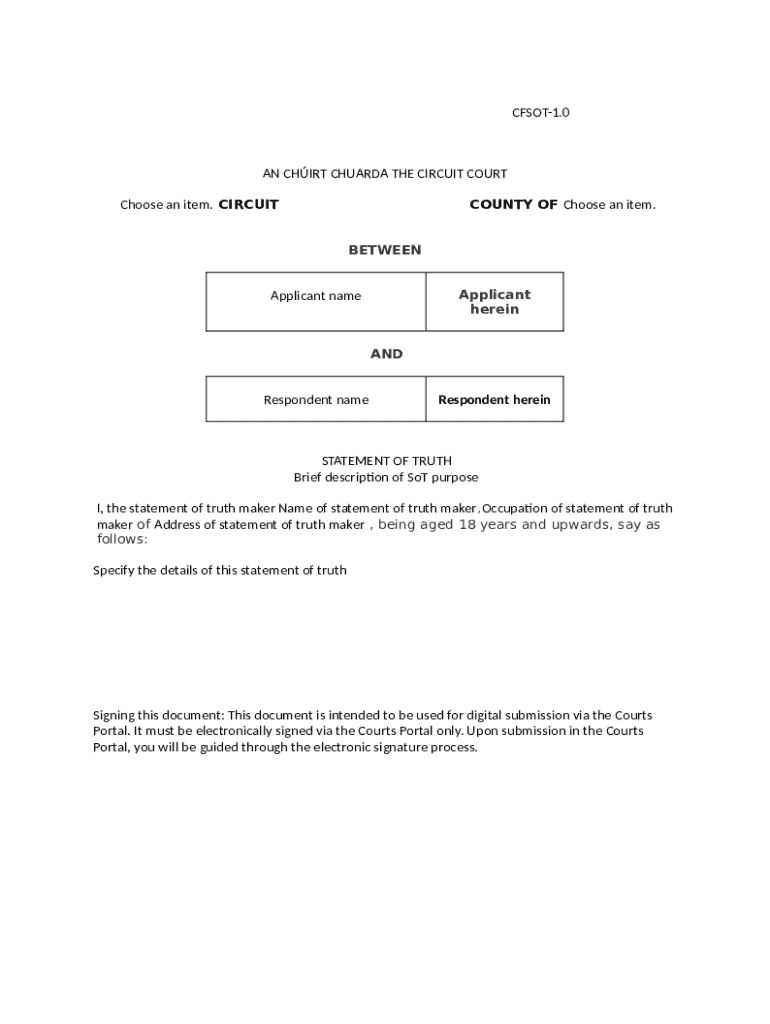 The Circuit Court Statement of Truth is a fundamental legal document used within the Irish legal system. It serves as a declaration of the truthfulness of the information provided in legal submissions. This document is facilitated through a digital submission process via the Courts Portal, ensuring streamlined operations for legal matters.
