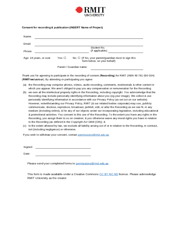 The Consent for Recording & Publication is a consent form used by RMIT University to obtain permission from participants for recording and publication of their content.