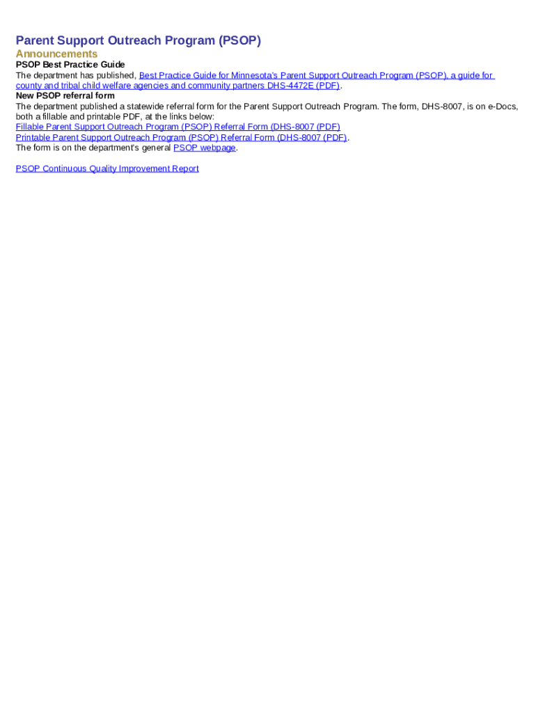 The Parent Support Outreach Program Referral Form is a government document used by child welfare agencies in Minnesota to refer individuals to the PSOP for assistance.
